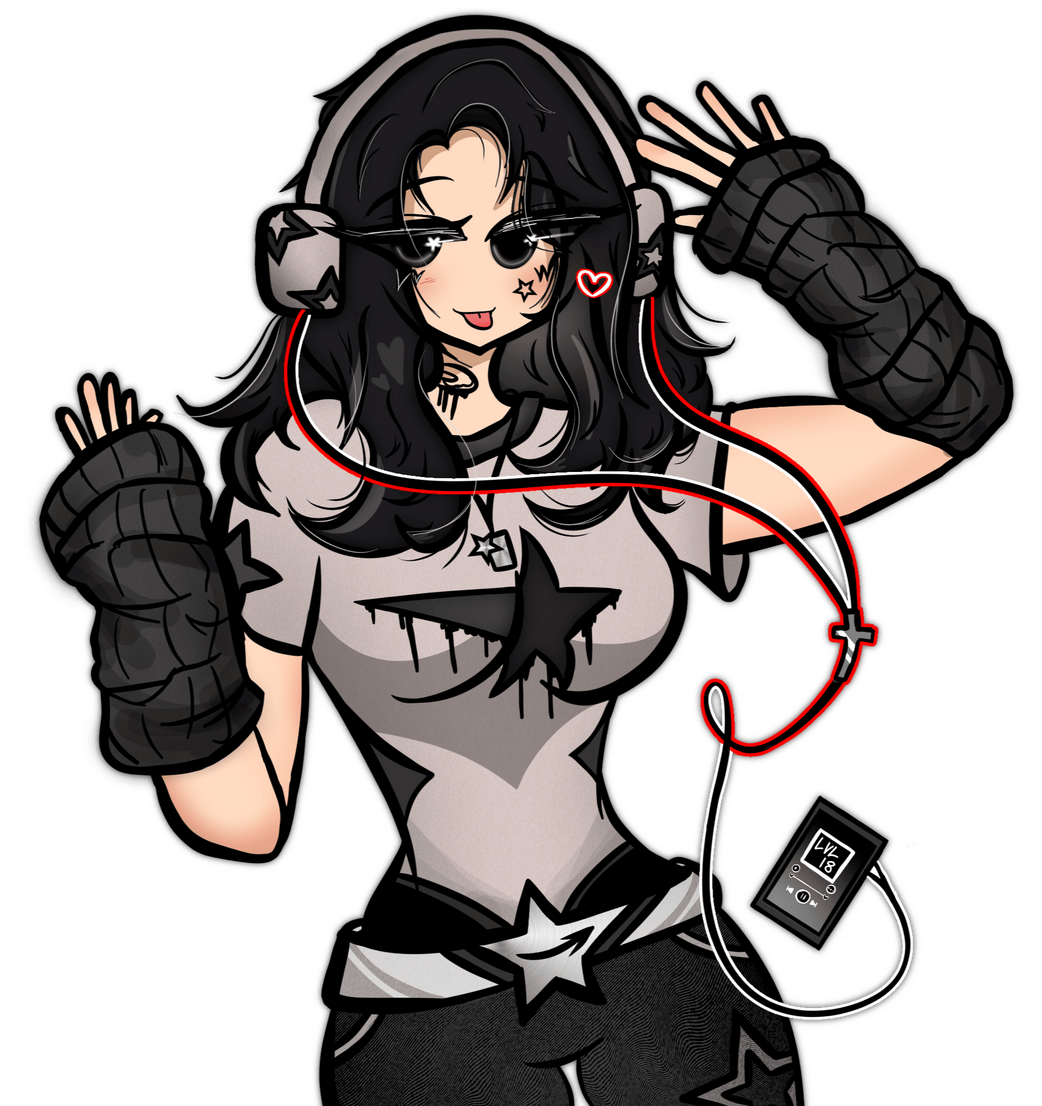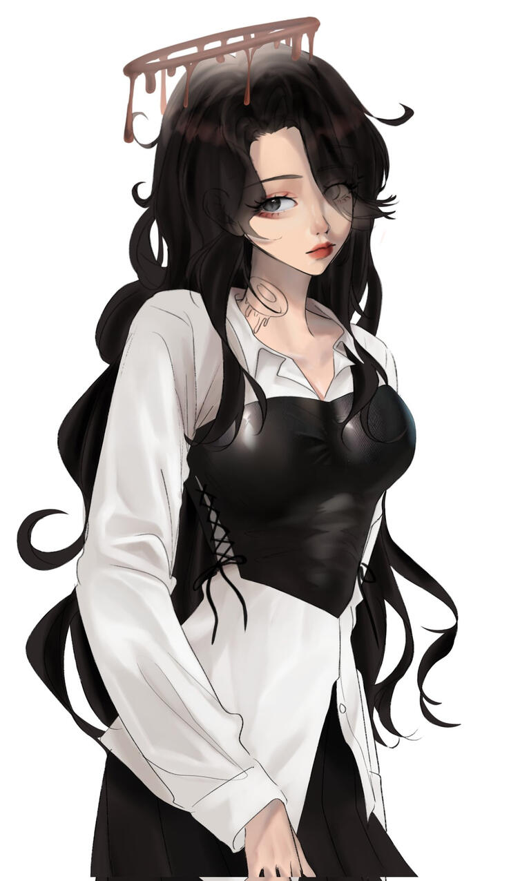 amber eyes, black hair, halo, cross hairpin, earbuds.!! do not draw her suggestively. !!